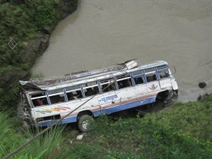 Continúa el viaje. De repente vemos una conglomeración de personas al lado de la carretera. El conductor del microbus nos dice que la noche anterior cayó por el precipicio un autobus que transcurría entre Lumbini y Kathmandu. Han muerto una decena de personas atrapadas. A pesar de estremecernos es algo que ocurre con bastante frecuencia, nos dice. De noche el camino es oscuro, no hay luces que sirvan de guía por las curvadas y estrechas carretas y a menudo los choferes se duermen. Nos detenemos para bajarnos del autobus y ver la tragedia.