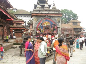 Entramos a Kathmandu por fin. Llueve mucho. Hay bastante actividad en la calle, pero la visibilidad es poca por las condiciones del tiempo y estoy agotada (y con menos capacidad observadora) por el viaje. El microbus nos deja frente al hotelito donde nos estaremos alojando. Dejamos las mochilas dentro y decidimos darnos un paseo por la Plaza Durbar en el centro de la ciudad.