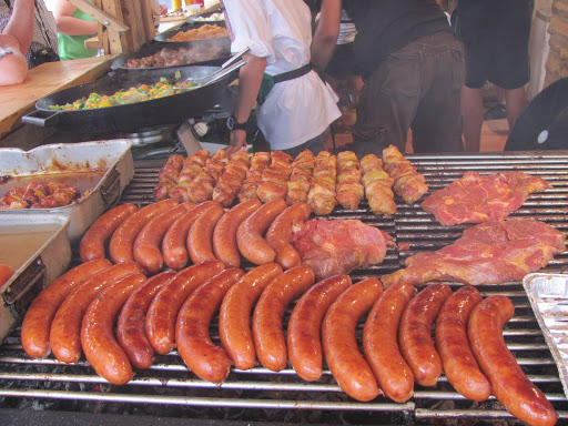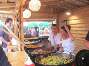 Una de las primeras paradas fue este kiosko con la mejor comida! En una paellera enorme tenían carne de cerdo, en otra papas típicas polacas, en otra pierogi (¨dumplings¨ polacos rellenos de mil cosas), también setas, vegetales, varios tipos de panes diferentes y en la parrilla, mucha carne obviamente: pinchos, salchichas de diferentes tipos, churrascos, etc.