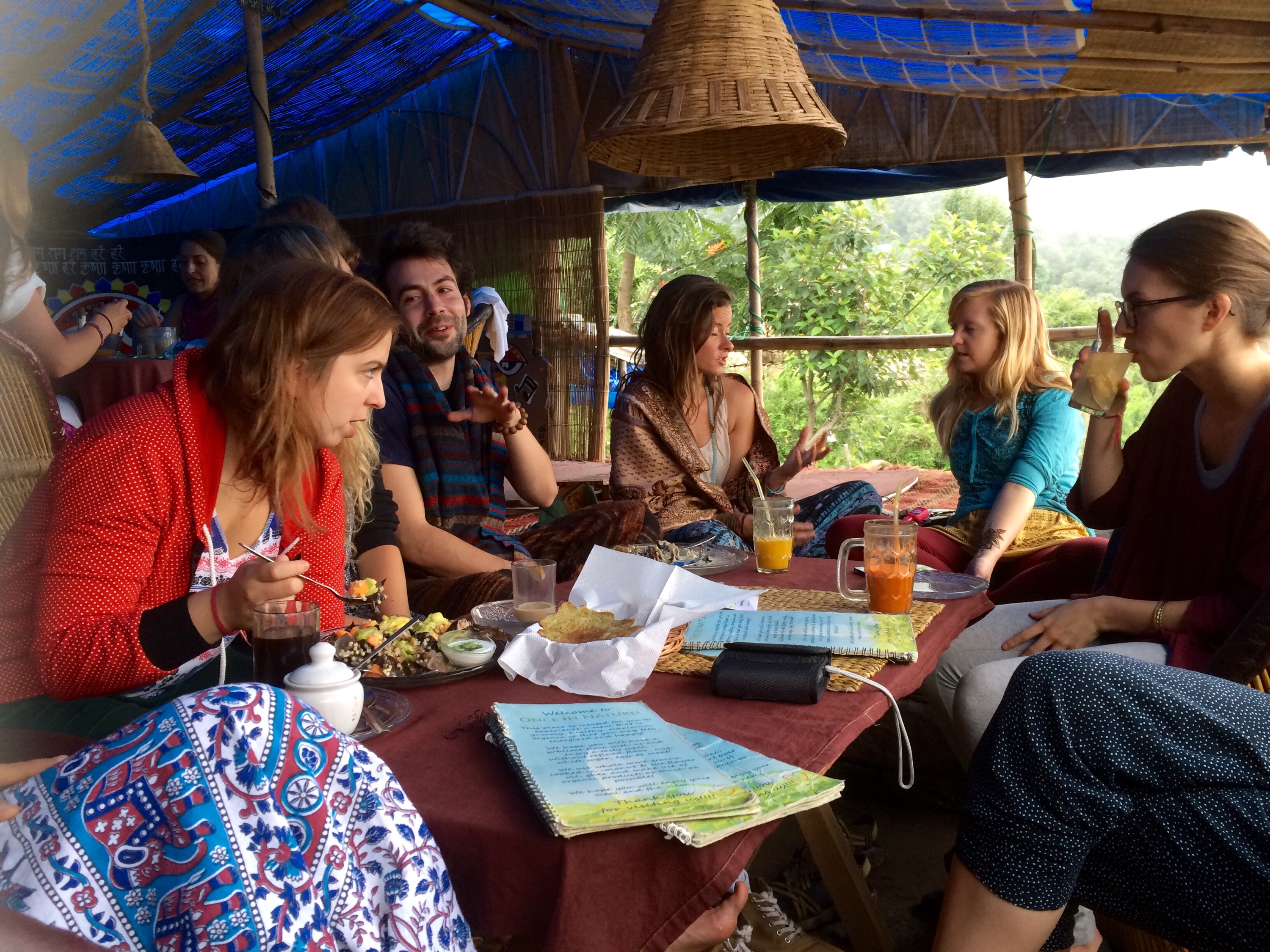 El lugar se llama Once in Nature y yace cerquita del pueblo Dharamkot, en el norte de la India. Llevo dos semanas viviendo cerca de este espacio que es una especie de café, restaurante y jangueo nocturno, donde está prohibido tomar alcohol (como en muchos otros lugares de India). Hasta ayer no lo había visitado, pero aproveché el fin de semana que tengo libre del curso de yoga que hago durante este mes para adentrarme en los montes himalayos y conocer Once in Nature. Particularmente ayer valía la pena hacerlo, pues se había anunciado que harían un baile meditativo y organizamos ir con todo el grupo de compañeros y futuros maestros/as de yoga.