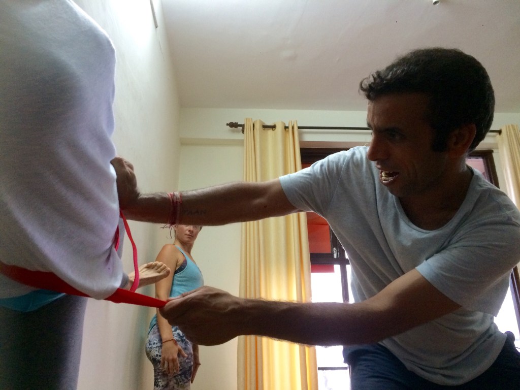 Comencé a notar esta tradición de «tough love» el día que un compañero indio del grupo, Akshe, compartió con todos nosotros anécdotas de su primer guru de yoga. Decía que su maestro llevaba siempre un palo en la mano y solía pegarle cada vez que no hacía una postura correcta. Le alzaba la voz, le daba cantazos con la mano para avisarle que debía subir más el pecho o enderezar la espalda. Hoy en día, Akshe es el mejor alumno del grupo. Su cuerpo es tan flexible como un trozo de goma. Puede moldearse de una y mil maneras y lo hace todo con enorme facilidad y confort. Ahora que es profesor de yoga, también instruye practicando esta técnica de «tough love».