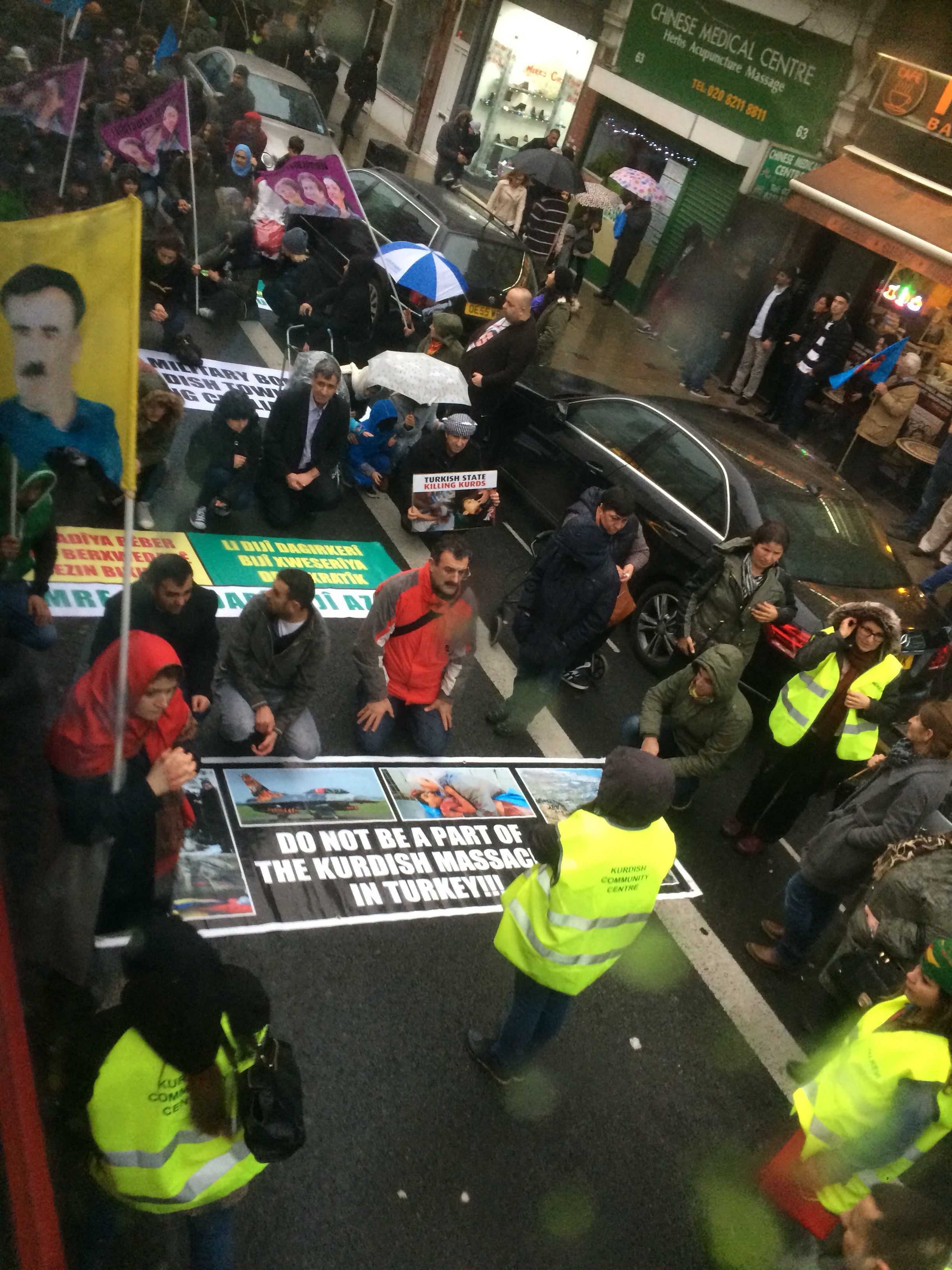 En esa tierra de nadie, nadie habla inglés. Ni siquiera el conductor es un local. Todos estos immigrantes llegan, de alguna manera y por la misma razón, a Wood Green. Me detengo una vez más a mirar por la ventana. Esta vez el tráfico ha sido detenido por una manifestación de turcos que abogan porque se detenga la masacre de kurdos en su país. Una mujer de voz ronca grita por un altoparlanteante ante una multitud de personas todas arrodilladas en la calle y mojándose por la lluvia. No hablan inglés. Los policías que controlan el paso vehicular tampoco son británicos. Tengo que hacer un esfuerzo por recordar que aún estoy en Londres y no en Anatolia.