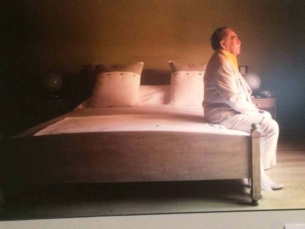 La foto de Gabo es una de las que más llama la atención. Aparece sentado sobre una cama de sábanas y cojines blancos, pensativo y con la mirada fija hacia el lado derecho. Una luz tenue le alumbra la cara y su atuendo igualmente blanco y puritano crea una sensación de integridad y pudor. Parece ser como si quisiera encontrar entre la luz alguna fuente de inspiración o solución a sus trabas de escritor.