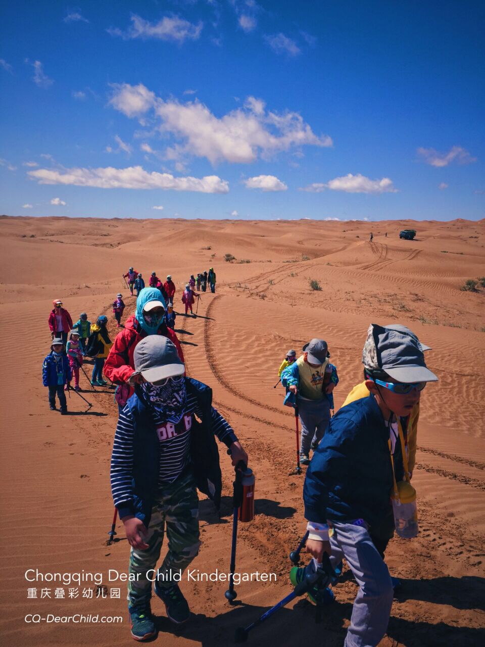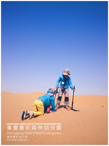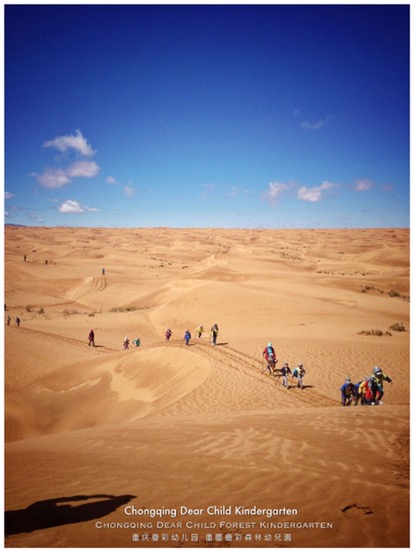 Niños se apoyan entre sí haciendo senderismo.Tomek (apodo en polaco de Tomasz) nos cuenta que una de las más recientes excursiones en las que él pudo asistir fue al desierto Tengger, ubicado en la región de Mongolia interior, cerca de la frontera de este país con China. 38 niños de entre cuatro y cinco años, junto a 15 maestros, asistieron al viaje que incluyó: un vuelo de una hora, pernoctar una noche en Changliushui (una aldea a medio camino), un viaje en caravana descapotable, senderismo por las dunas, acampar una noche en el medio del desierto y luego a la vuelta, dormir una noche en un hotel.