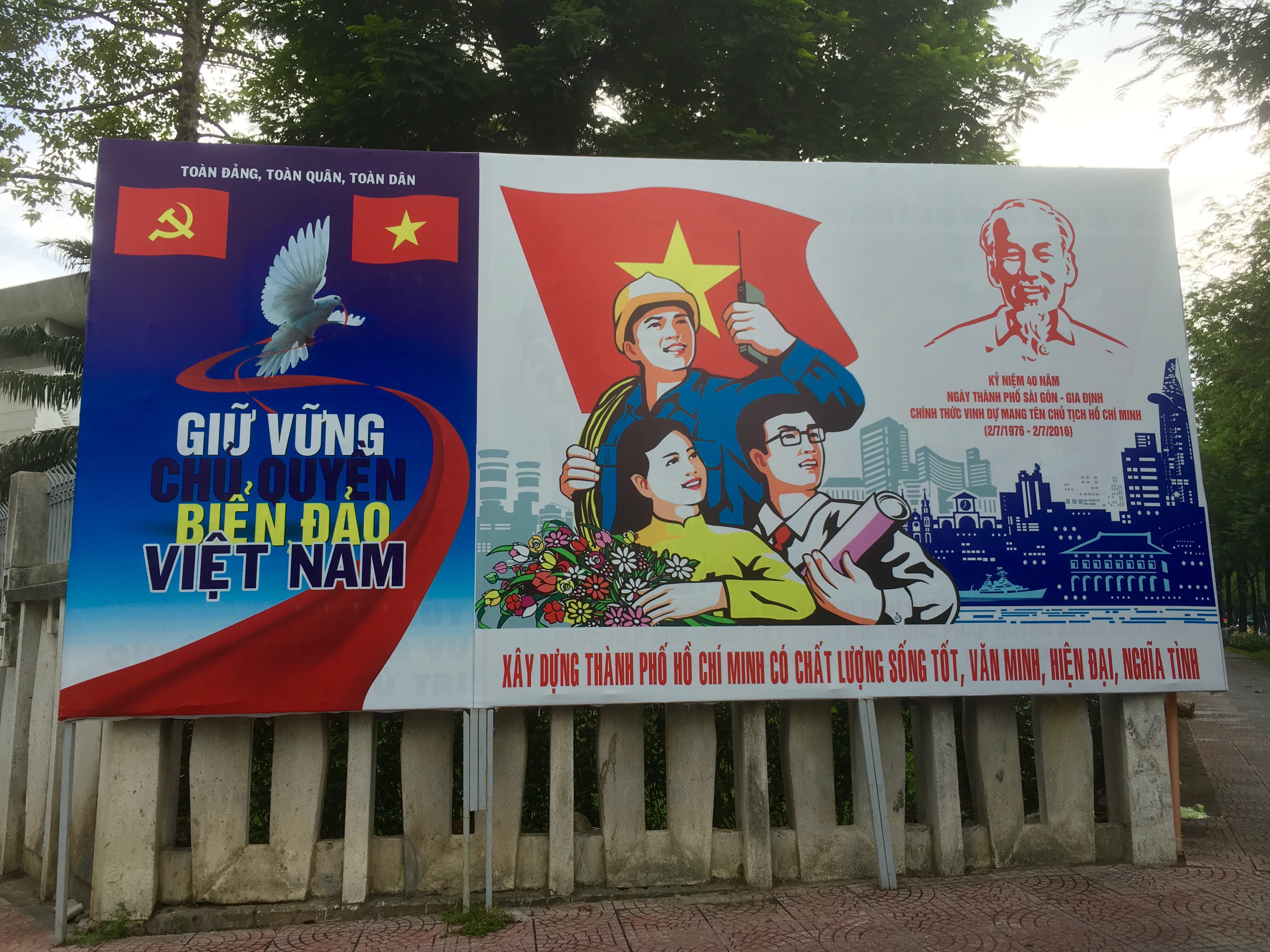 Me agarro suavemente del mango de la moto y observo mi alrededor. Carteles soviéticos de colores subidos me rodean. El rojo parece ser el favorito de este país, seguido del amarillo u oro- los tonos de la bandera. El rostro de Ho Chi Minh- quien es venerado casi como un dios por los vietnamitas- aparece en casi toda la propaganda. Dibujos de obreros, campesinos y niños le rodean.