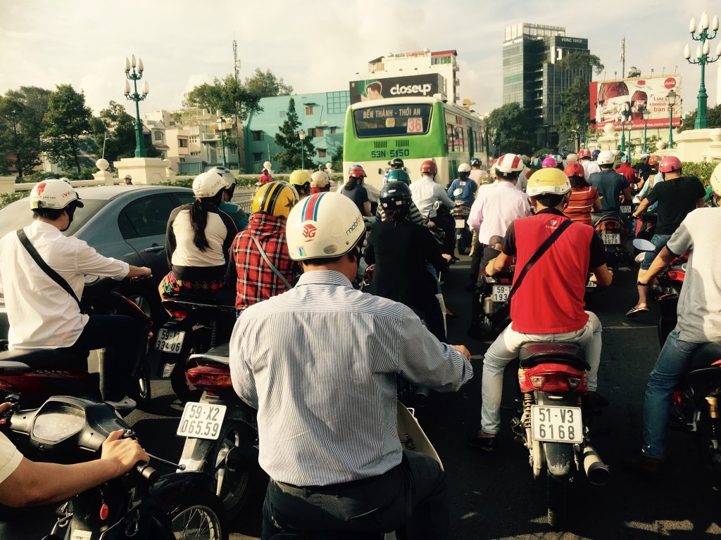 La ciudad de Ho Chi Minh- capital de Vietnam y antigua Saigón- alberga más de 8 millones de personas, una cantidad que no parece exorbitante al compararse con otras urbes en Asia. Sin embargo, se considera una de las más densas y, cuando a esto le añades la enorme cantidad de motocicletas que se desplazan de un lado a otro por la ciudad como arterias- la metrópoli se transforma en una impenetrable e indescifrable telaraña de bocinazos, cascos, taxis, llantas y vehículos sobre ruedas. Cruzar de un lado a otro en la calle es misión casi imposible; intentar detener un taxi, incluso peor.