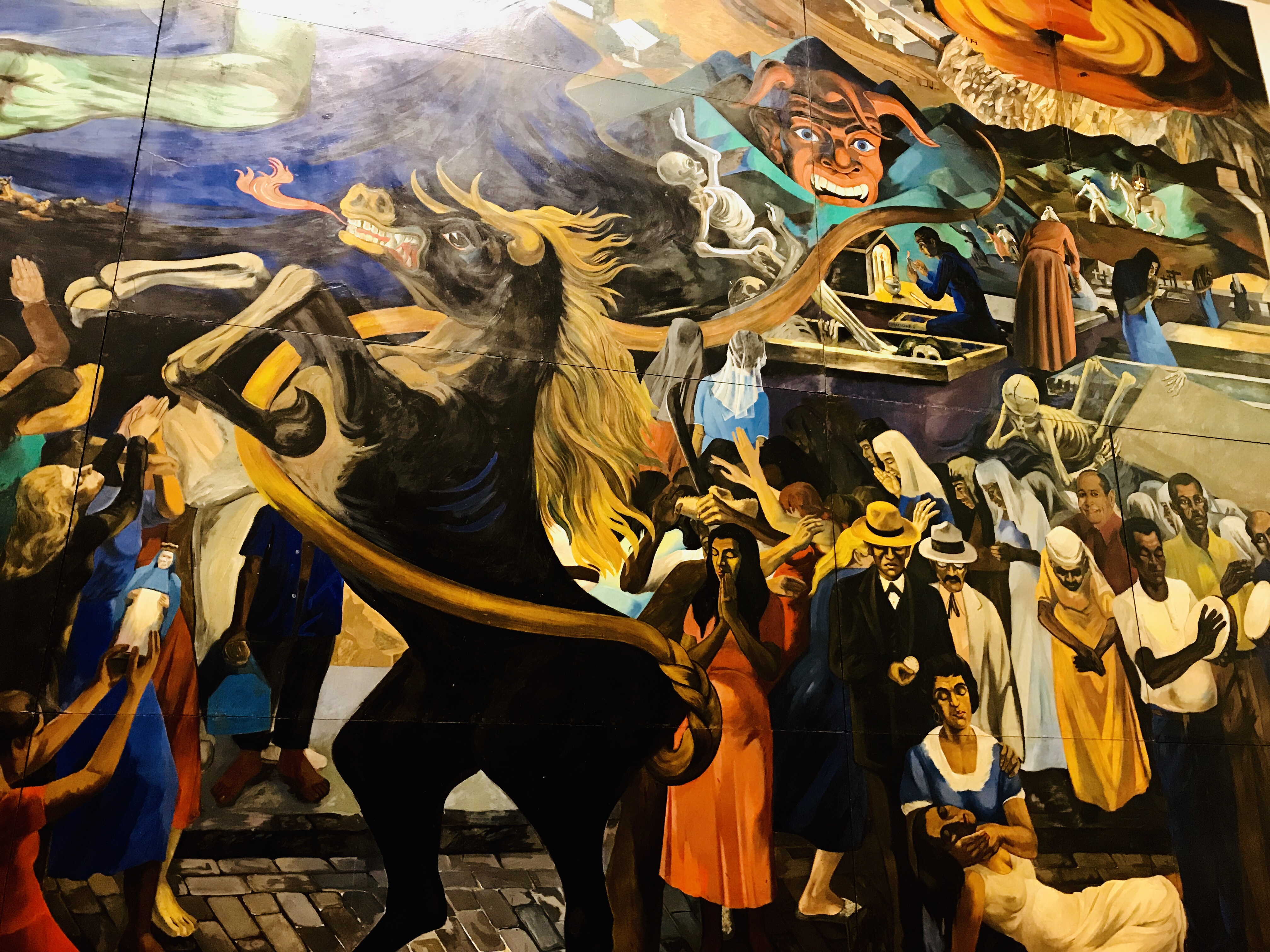 Del Teatro pasamos directamente al cuarto piso donde inicia el recorrido de Puerto Rico Plural. El grupo presente se detiene en la primera sala, la Sala Horizonte, frente a una de las obras de Rafael Tufiño, producida entre 1952 y 1954. Se titula La Plena y se trata de un mural construido sobre paneles de madera, pero también de una obra multidisciplinaria donde se combina el pasado, el presente y el posible. El mural es un tributo a la radio cantada, en el que se perciben doce plenas ilustradas al estilo del maestro Tufiño. Escenas de Cortaron a Elena y que aparecen también en una película grabada para la División de Educación a la Comunidad, agencia en la que colaboró Jack Delano y su esposa, Irene para la década del 50. La Plena es una obra impresionante y muy divertida, en la que se esconden secretos y es palpable la influencia del muralismo mexicano y sus exponentes, como Diego Rivera, entre otros.