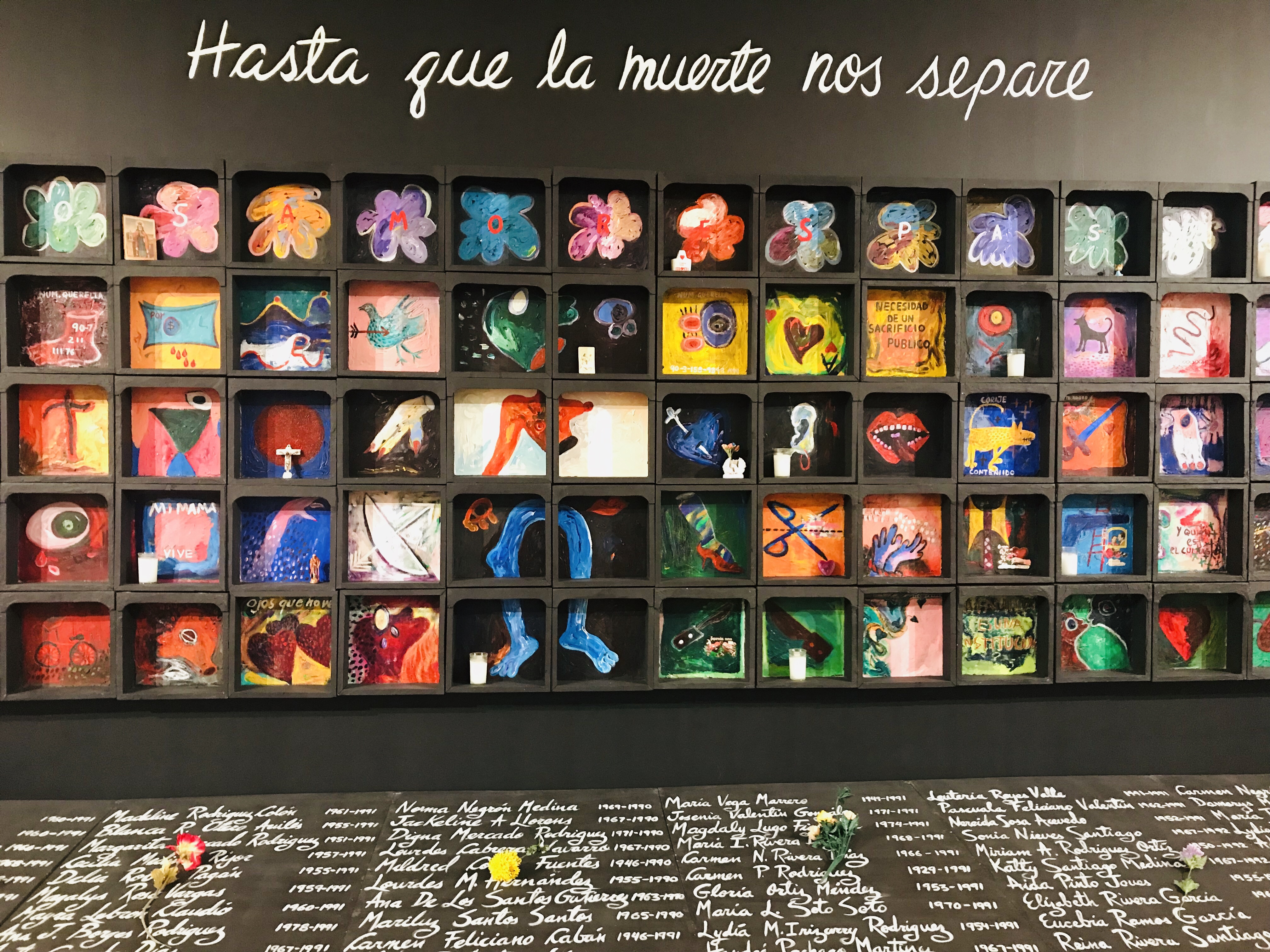 Justo enfrente de La Plena yace otra instalación que fácilmente atrapa la atención de cualquier visitante. Nuestra guía, Noemí Sierra, nos dirige hacia ella. Se titula Hasta que la muerte nos separe, fue producida entre 1991 y 1993 y es una obra de la artista Anaida Hernández, inspirada en el trabajo investigativo de la periodista Carmen Enid Acevedo. A simple vista parece una oda a un camposanto, pero de cerca puede percibirse el real interés tanto de la investigadora, como de la autora de la obra: hacer un homenaje a las mujeres asesinadas a manos de sus parejas o exparejas durante esta época. La simulación de cada urna lleva el nombre real de una mujer asesinada, acompañado de artículos de recuerdo: flores, figuritas, mensajes escritos por sus hijos, rosarios, velas, entre otros. Fácilmente podrían encontrarse paralelos entre la obra producida en la década del 90 y la actual realidad que enfrenta la isla en términos de casos de violencia hacia la mujer y desigualdad de género.