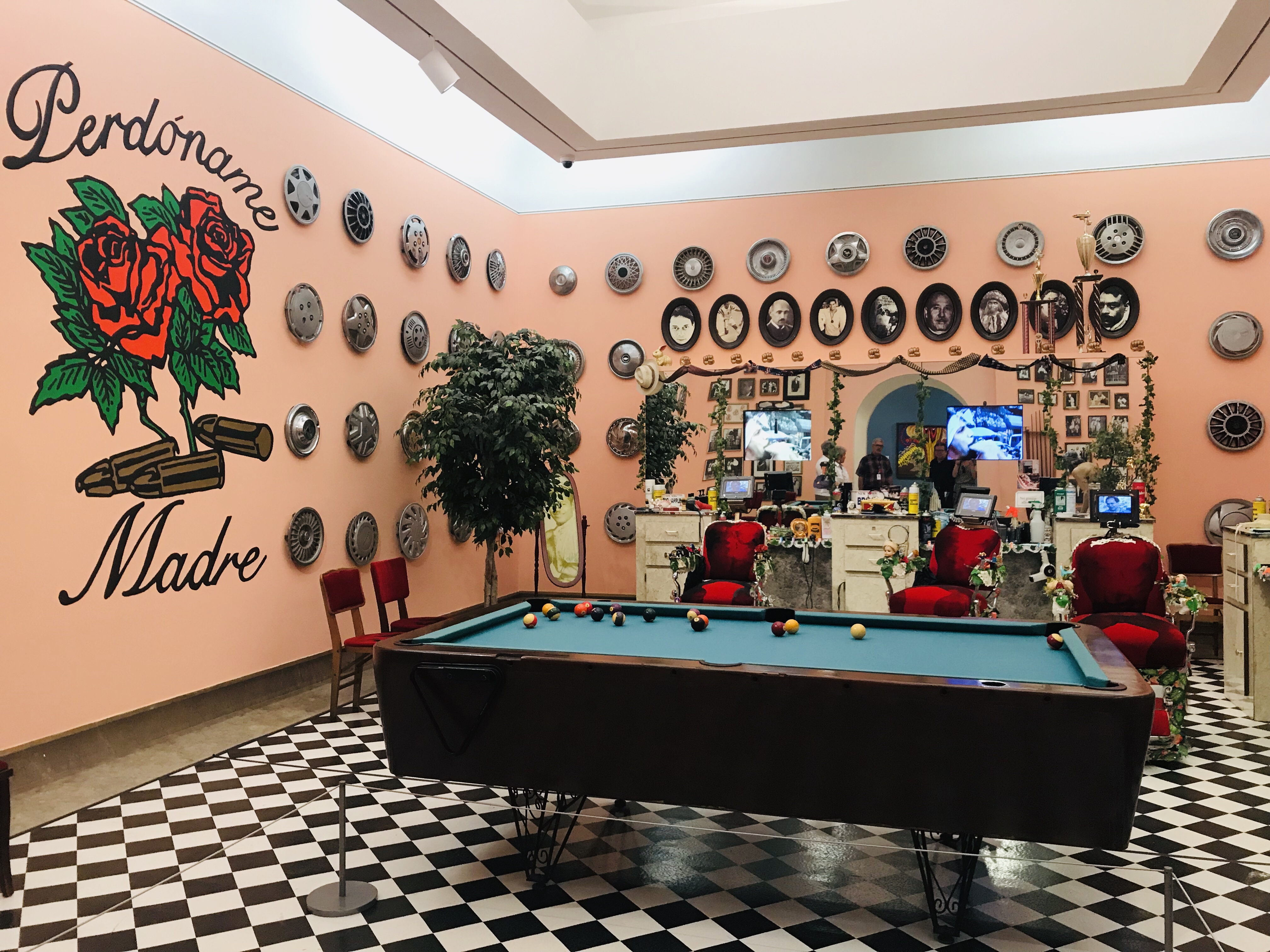 Una de las instalaciones más concurridas de la expo Puerto Rico Plural es la obra de Pepón Osorio: En la barbería no se llora (1994). Una vez tomé el primer paso dentro de la sala y observé mis alrededores, sentí que me quedaba sin aire y la piel se me erizaba: ¡qué energía se percibe allí! En forma de crítica, el artista construye una satírica representación del machismo personificado en una barbería puertorriqueña de Nueva York. Objetos como aros de carros deportivos, productos de belleza que aluden a la masculinidad, una mesa de billar, fotos y vídeos donde aparecen representaciones de hombres boricuas muy corpulentos y varoniles, entre otros, construyen un imaginario colectivo de lo que representa ser un hombre puertorriqueño (muy macho) en la diáspora. La frase pintada en la pared, explica nuestra guía, alude a un tatuaje común que se hacían los soldados puertorriqueños en la cárcel: Perdóname madre. Según Sierra, también está presente el sincretismo religioso en la instalación, por medio de la figura bíblica de Lázaro, que reúne tradiciones católicas con la santería y la mitología.