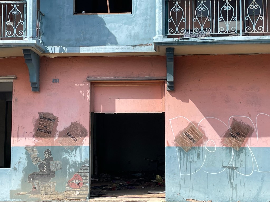 “Quisiera conseguir otra cosa”, se decía a sí mismo mientras esperaba que cambiara el semáforo. A su izquierda, un edificio abandonado, que en su momento de esplendor se veía que era de estilo art deco. Ahora solo quedaban las paredes pintadas de un rosa viejo mareado por el sol y el abandono. Tres carteles, viejos también, pegados encima de las paredes leían: “Obedece”. “Consume”. “No protestes”. De repente se cuestionó si aquellos mensajes eran algún tipo de señal del más allá.