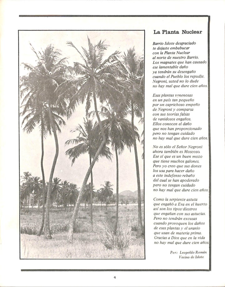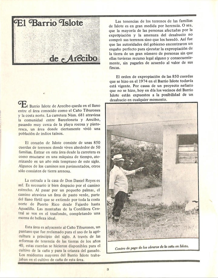 “Durante mi infancia, había el ancón que transportaba a la gente de Arecibo a Islote por el Río Grande, área cercana a su desembocadura, desde El Fuerte hasta Vigía. El ancón no era el embarcadero donde se abordaba, sino una balsa amplia que impulsada por una pértiga hacía avanzar Pepe Marín por el río entre el Manglar de Jareales hasta alcanzar la banda oriental del cuerpo de agua”.