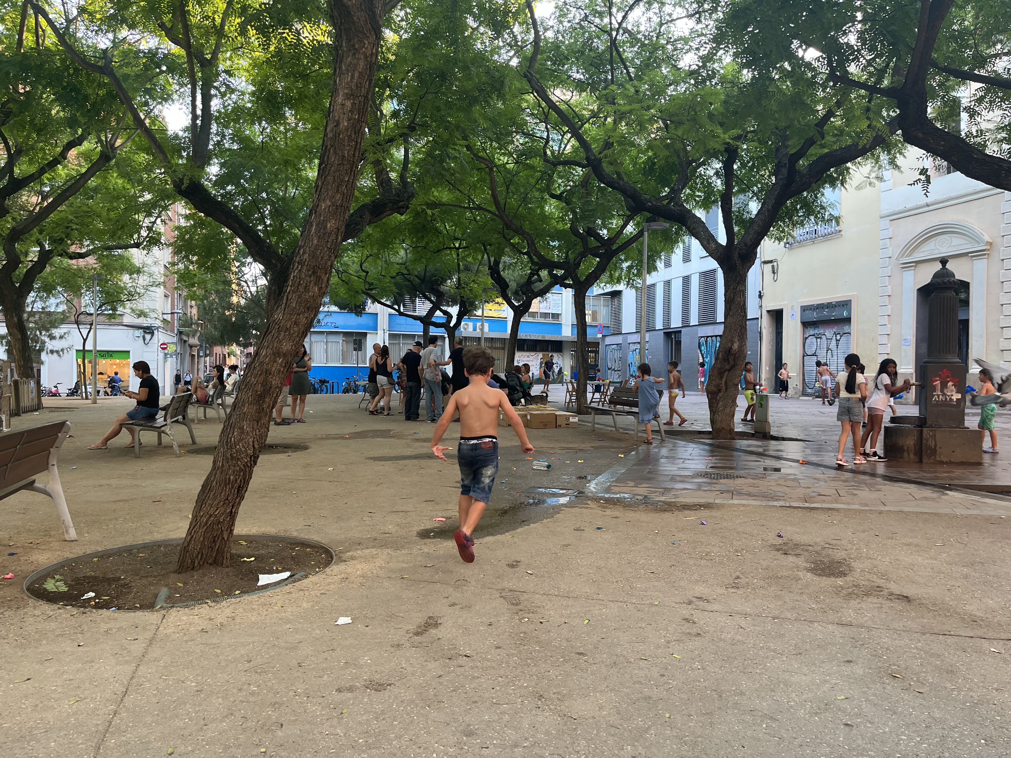 Se acerca una niña de siete años a una fuente pública a llenar su globo de agua. Tres amiguitos la siguen para hacer lo propio. Hablan entre sí en catalán. En la esquina de enfrente dos niños marroquíes pre adolescentes ríen en árabe y se lanzan por una chorrera pequeñita de un parque infantil. Al fondo de la plaza hay otro grupo de jóvenes mayorcitos que juegan fútbol sin camisa; unos son peruanos criados en Barcelona, otros africanos, la mayoría catalanes. El grupo de los más pequeños corre descalzo con pistolas de agua en mano, mojando a quienes se encuentran de frente.